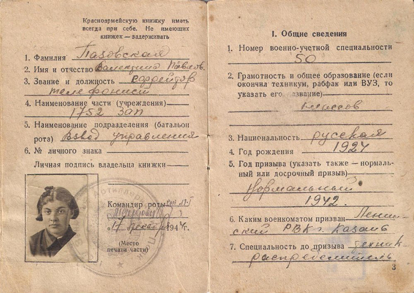 В 1941 г. мама вместе с заводом эвакуировалась в г. Казань. Весной 1942 года она отправилась добровольцем в армию. После окончания специальных курсов служила телефонисткой в 1752 зенитном артиллерийском полку 55 зенитной артиллерийской дивизии на ст. Вешняки под Москвой. Зенитная батарея защищала московское небо от немецких самолетов.