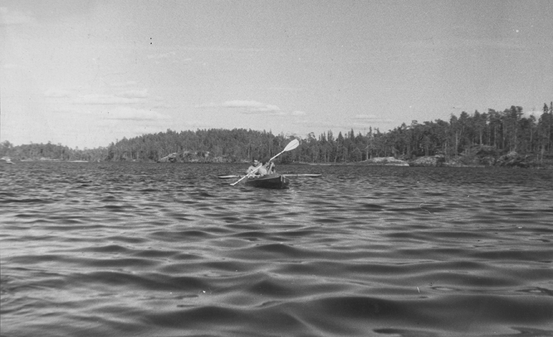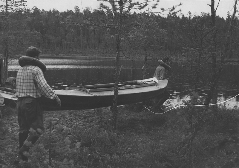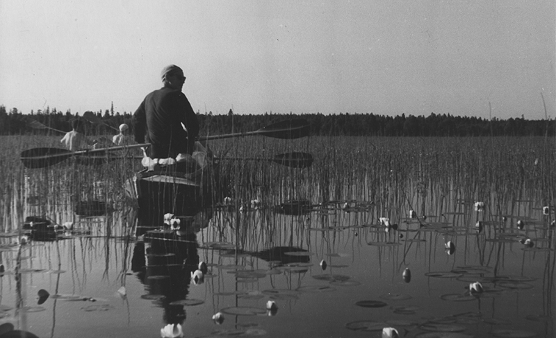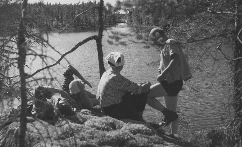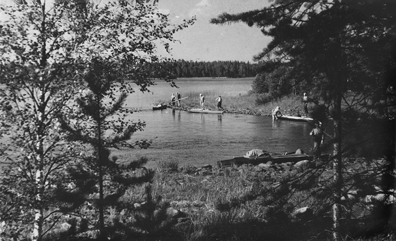На обед остановились, проплыв озеро на чудесном песчаном берегу. Песок какой-то особый – блестящий и совершенно белого цвета. Чистейший берег. Забрались справа на невысокую сельгу с Ю. Александровым. Вид оттуда изумительный. С нее хорошо просматривается дальнейший путь через протоку. Много черники. Разбросаны камни, вокруг покрытые лишайником, который вырос какими-то концентрическими окружностями. На холме очень сухо.