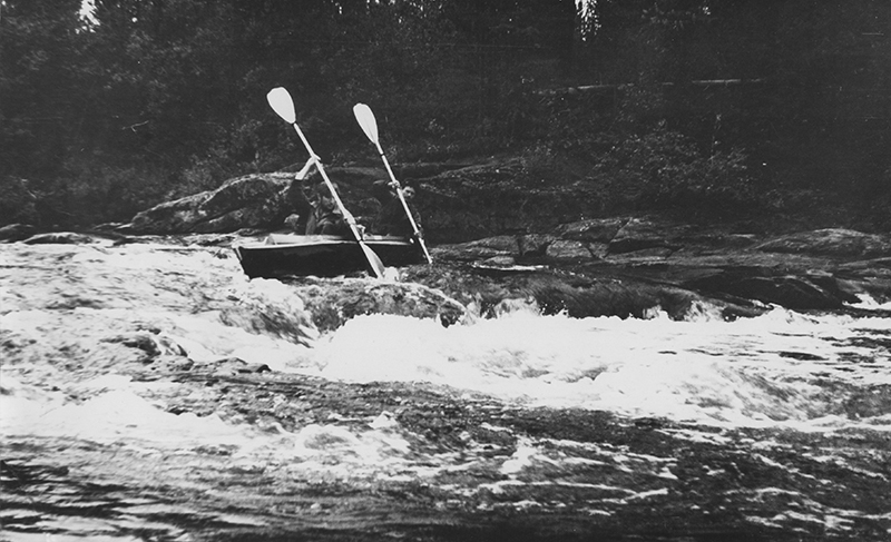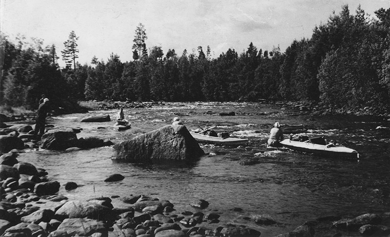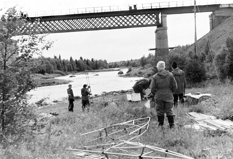 ...Вот она, наконец, речка Воньга, с которой мы должны начать наше путешествие вверх по течению. Около ж/д моста, на полянке, поросшей густой, сочной, сырой травой с черникой, мы в течение 4-х часов собирали и подготавливали байдарки. Однако сразу было ясно, что Воньга как-то совсем не похожа на Протву, скорее, она напоминала горную реку, и было весьма странно, как можно было идти по ней не только вверх, но и вниз на байдарках. Как это делать, наш шеф Юра Александров, или как все его называют – Иваныч, популярно нам объяснил: надо прежде всего раздеться, а потом надеть на ноги носки и ботинки. После этого спустить байдарки на воду, нагрузить их полным грузом и, войдя в воду, толкать их вверх по течению, помня при этом два условия: чтобы течением тебя не сбило с ног и ты не утонул, и чтобы не дать тому же течению вырвать байдарку из твоих рук и унести. Я, например, не совсем понял, какому условию надо отдавать большее предпочтение. Через 15-20 минут после теоретического введения Иваныча насчет проведения байдарок через пороги мы начали наш поход, но не на байдарках, а пешком вверх по течению бурной порожистой Воньги…