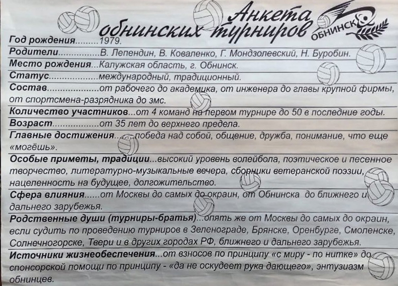 По окончании турниров беседам, рассказам и песням под гитару не было конца, что положило начало литературно-музыкальному творчеству ветеранов. Спортивная часть была очень важной частью ветеранских турниров. Но ехали в Обнинск ветераны не только за этим. Интеллектуальная составляющая, творческое начало – вот что манило. Ни один вид спорта не собрал такого количества народного фольклора, как волейбол.