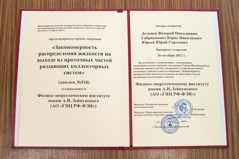 Сотрудники ГНЦ РФ – Физико-энергетического института им. А.И. Лейпунского, авторы научного открытия «Закономерность распределения жидкости на выходе из проточных частей раздающих коллекторных систем» – доцент, д.т.н. Валерий Дельнов; старший научный сотрудник, д.т.н. Борис Габрианович и профессор, д.т.н. Юрий Юрьев – были награждены дипломами и почетными медалями Петра Капицы, а сам Физико-энергетический институт – соответствующим свидетельством Российской академии естественных наук.