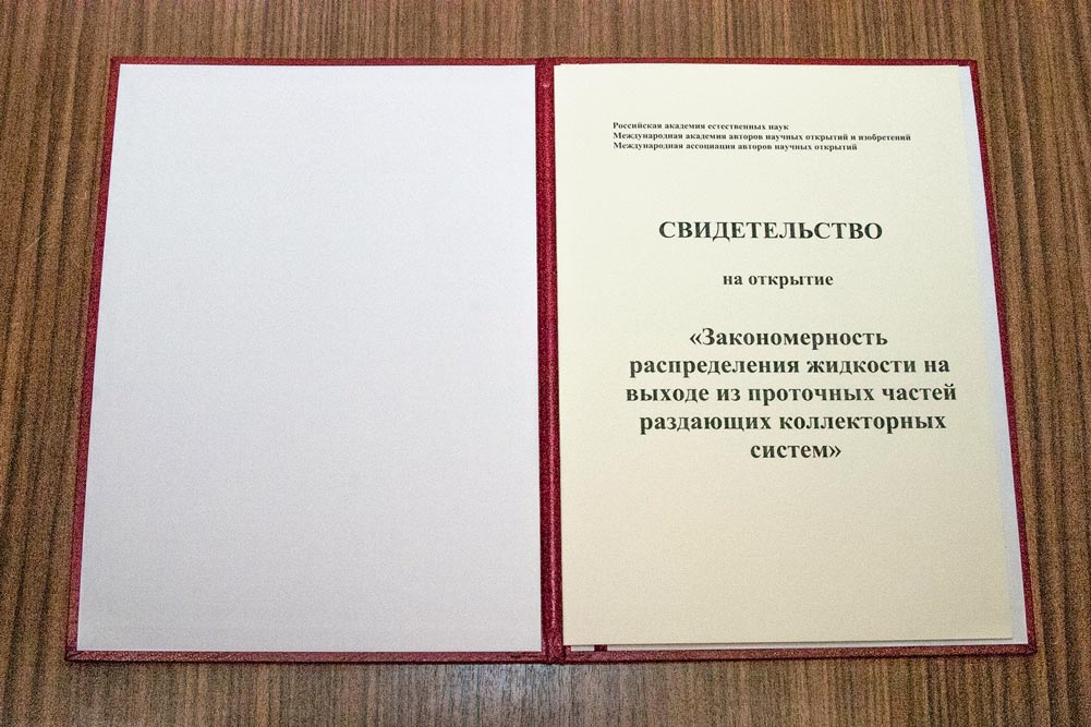 Экспериментальным и расчетно-аналитическим путем была установлена неизвестная ранее закономерность распределения жидкости на выходе из осесимметричных раздающих коллекторных систем цилиндрического и плоского типа с обратным поворотом потока в коллекторе. Новизна научного открытия обусловлена установленной авторами ранее неизвестной закономерности распределения жидкости на выходе из проточных частей затесненной и свободной РКС с различными местами подачи жидкости в коллектор, принципиально отличающаяся от ранее установленных и изложенных в научно-технической литературе закономерностей распределения жидкости на выходе из проточных частей сверхзатеснённых и сверхсвободных РКС.