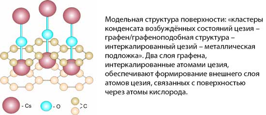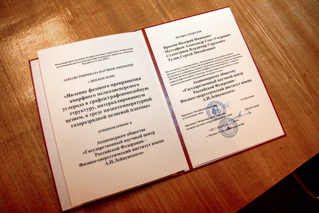 В научном открытии № 509 в области физики плазмы обнаружен новый физический механизм ранее неизвестного явления превращения аморфного мелкодисперсного углерода в гетерогенную анизотропную двумерную структуру углерода и управляемого снижения работы выхода электронов до аномально низких значений ~1–2 эВ за счет образования дипольного момента на границе раздела графен/графеноподобной структуры с низкотемпературной цезиевой плазмой, содержащей конденсат возбужденных состояний цезия.