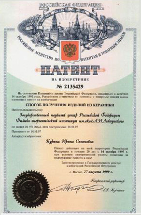 - Патент РФ №2323912 (2008) «Способ изготовления изделий из оксидной керамики с повышенной теплопроводностью».