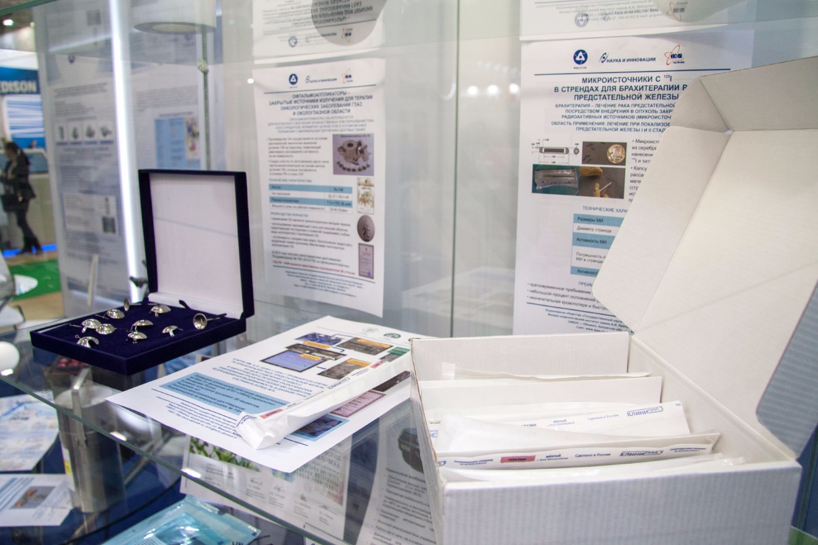 В составе коллективной экспозиции Госкорпорации «Росатом» Физико-энергетический институт представил генератор рения W-188/Re-188 для терапии онкологических заболеваний, офтальмоаппликаторы для контактной лучевой терапии злокачественных новообразований органов зрения, генератор технеция 99Мо/99mTc, фильтроэлементы для очистки жидкостей и газов, микроисточники с I-125 для брахитерапии. Производство отечественных микроисточников, которым до настоящего времени практически не было альтернативы, позволит обеспечить российские клиники и существенно снизить стоимость проводимых операций.