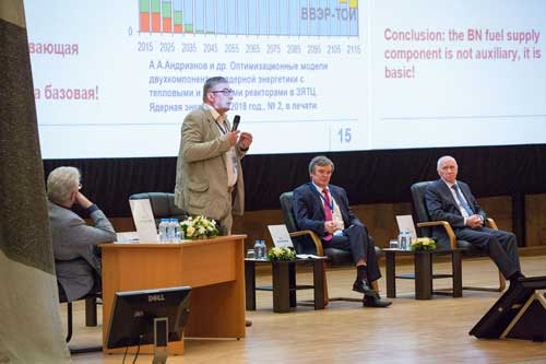 В рамках пленарного заседания и панельной дискуссии ученые ГНЦ РФ – ФЭИ и концерна «Росэнергоатом» представили собственное видение будущего развития ядерной энергетики России. Перспективный взгляд большей части научного сообщества на двухкомпонентную атомную энергетику в своем докладе отразил заместитель генерального директора – директор Отделения ядерных реакторов и топливного цикла ГНЦ РФ – ФЭИ Андрей Гулевич. Он рассказал об идеологии замыкания топливного цикла двухкомпонентной ядерной энергетической системы и о роли реакторов на тепловых и быстрых нейтронах в ней. «Первостепенную важность для выработки стратегии имеют системные исследования. На наш взгляд, требования к естественной безопасности в отношении натриевых реакторов должны быть актуализированы в соответствии с их функциональными значениями в двухкомпонентной системе. Необходимо уже сейчас комплексно принять решение о сооружении головного блока БН-1200 как основу будущей топливообеспечивающей компоненты атомной энергетики России», – подчеркнул Андрей Гулевич.