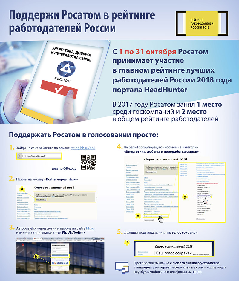 Принимать участие в голосовании могут сотрудники всех организаций отрасли, члены семей, партнеры, клиенты, соискатели, студенты – каждый, кто неравнодушен к Росатому и имеет профиль на сайте https://hh.ru/ и в социальных сетях.