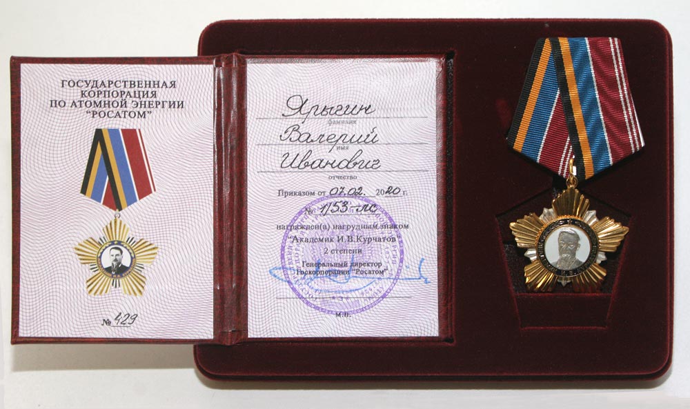 Отраслевой наградой – нагрудным знаком «Академик И.В. Курчатов» II степени награжден главный научный сотрудник по физике космических ядерных энергетических установок АО «ГНЦ РФ — ФЭИ», доктор технических наук, профессор Валерий Иванович Ярыгин за многолетнюю высокую результативность и значимость работы в интересах отрасли.