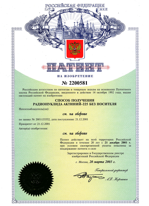 2 | 2200581 | 20.03.2003 | Способ получения радионуклида актиний-225 без носителя | Павлович В.Б., Дубинкин Д.О., Котовский А.А., Савинов В.М., Нерозин Н.А., Сметанин Э.Я. |