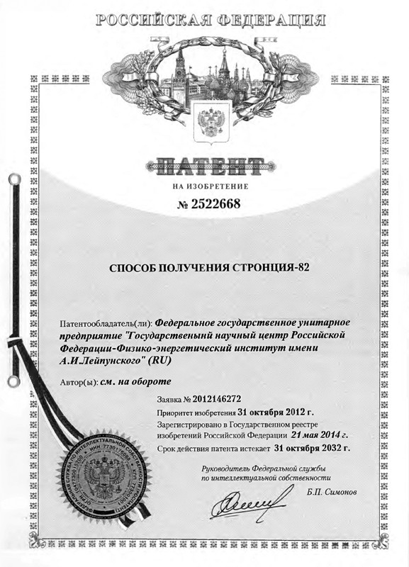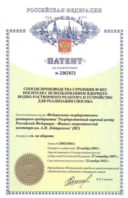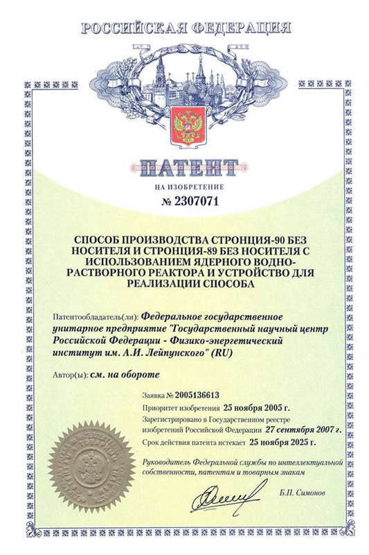 5 | 2307071 | 27.09.2007 | Способ производства стронция-90 без носителя и стронция-89 без носителя с использованием ядерного водно-растворного реактора и устройство для реализации способа | Ермолов Н.А., Зродников А.В., Нерозин Н.А., Сметанин Э.Я., Хамьянов С.В., Шаповалов В.В. |