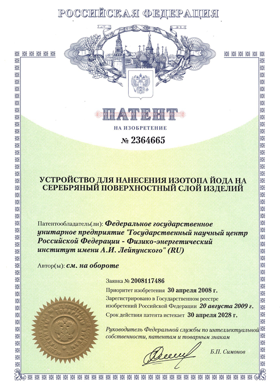 8 | 2364665 | 30.04.2008 | Устройство для нанесения изотопа йода на серебряный поверхностный слой изделий | Ермолов Н.А., Нерозин Н.А., Подсобляев Д.А., Распопов А.А., Сметанин Э.Я., Хамьянов С.В., Шаповалов В. |
