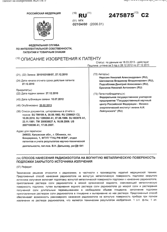 11 | 2475875 | 27.12.2010 | Способ нанесения радиоизотопа на вогнутую металлическую поверхность подложки закрытого источника излучения | Нерозин Н.А., Шаповалов В.В., Подсобляев Д.А., Ермолов Н.А |