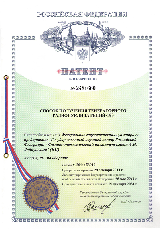 12 | 2481660 | 29.12.2011 | Способ получения генераторного рений-188 | Баранов Н.Г., Степченков Д.В., Нерозин Н.А., Сулим Е.В., Минко Ю.В., Семенова А.А. |