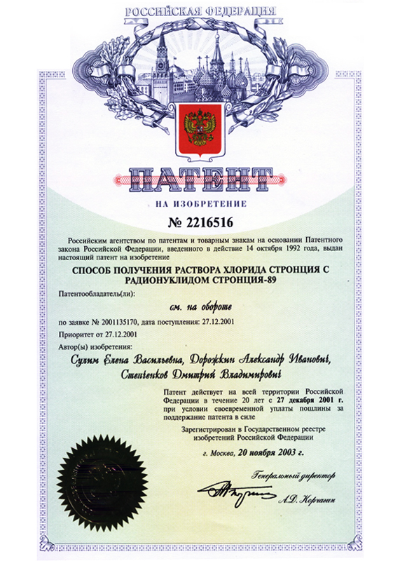 3 | 2216516 | 20.11.2003 | Способ получения хлорида стронция с радионуклидом стронция-89 | Сулим Е.В., Дорожкин А.И., Степченков Д.В. |