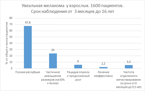 Брахитерапия как самостоятельный метод лечения увеальной меланомы (УМ) использована более чем у 1600 больных в возрасте от 18 до 82 лет, 65 % из которых составили женщины. Сроки наблюдения составили от 3 месяцев до 16 лет, медиана 71,1 месяца. Полная резорбция УМ достигнута у 67,8 % больных, частичное уменьшение размеров опухоли (на 50 % и больше) и стабилизация процесса – у 24% пациентов. Рецидив опухоли и продолженный рост выявлены в 6 % случаев. Лечение оказалось неэффективным у 2,2 % (35) больных. Частота отдаленного метастазирования составила 5,3 % (в сроки от 6 месяцев до 9,5 лет).