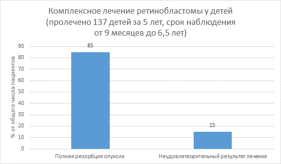 За 5 лет в комплексном лечении ретинобластомы брахитерапия была использована у 137 детей. Срок наблюдения составил от 9 месяцев до 6,5 лет. Полная резорбция опухоли отмечена в 85 % случаев.