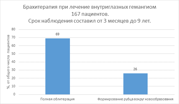 Для лечения внутриглазных гемангиом брахитерапия использована у 167 пациентов. Срок наблюдения составил от 3 месяцев до 9 лет. Полная облитерация новообразования отмечена в 69 % случаев, формирование рубца вокруг новообразования у 26 % больных. Т. е. эффективность локального контроля составила 95 %.