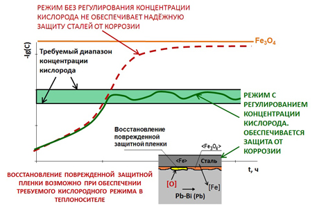 Для защиты конструкционных сталей от коррозии в контурах с ТЖМТ используется так называемая кислородная технология, которая заключается в формировании на поверхностях сталей защитных оксидных пленок. Для обеспечения целостности защитных оксидных пленок в процессе эксплуатации установки необходимо поддержание заданного кислородного режима теплоносителя. Избыток кислорода в ТЖМТ приведет к образованию шлаковых отложений на теплообменных поверхностях контура и оборудования. Малое содержание кислорода в теплоносителе при эксплуатации приведет к развитию коррозии конструкционных сталей.