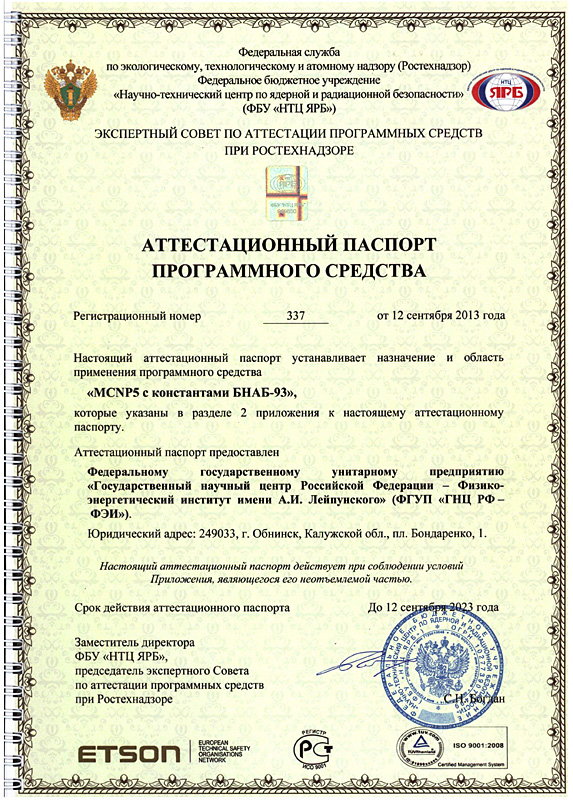 337 от 12.09.2012 MCNP5 с константами БНАБ-93 Аттестовано для расчета kэф критсборок (типа БФС) с урановым, плутониевым или смешанным (МОКС) топливом, активной зоны реактора БН-800 с урановым или МОКС-топливом и отдельных сборок и хранилища свежего топлива с урановым или МОКС-топливом