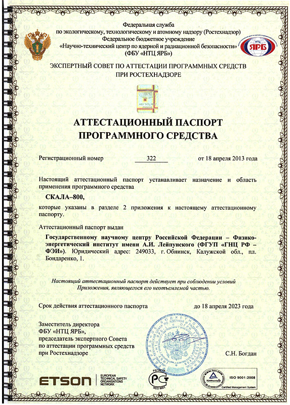 322 от 18.04.2013 СКАЛА–800 Аттестовано для расчета kэф, ТУК, ВТУК, складов свежего топлива, БСС и БОС, реактора БН-800 с загрузкой из свежего топлива