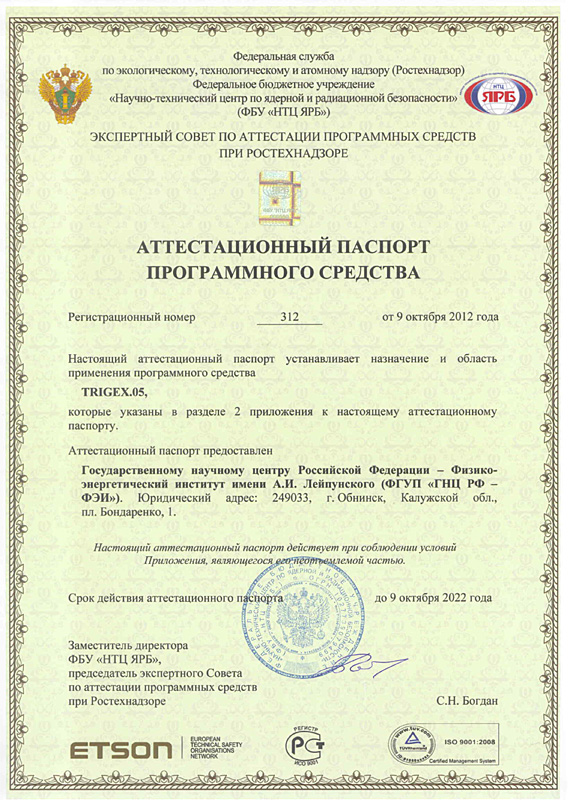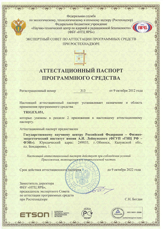 313 от 9.10.2012 TRIGEX.051 Аттестовано для расчета kэф, эффективности стержней СУЗ, АЗ и РС, темпа изменения реактивности при выгорании топлива, температурного и пустотного эффектов реактивности, эффективной доли запаздывающих нейтронов и пространственного распределения энерговыделения в реакторах БН-800 и критсборках БФС